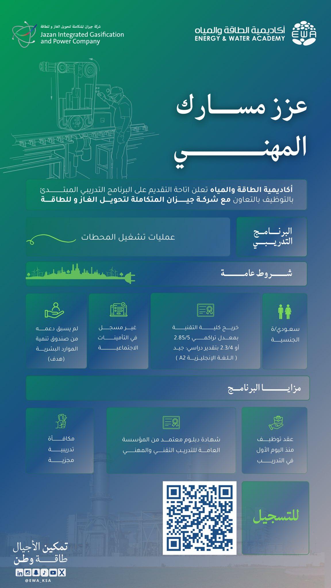 أعلنت أكاديمية الطاقة والمياه عن بدء التسجيل في برنامج تدريبي مبتدئ بالتوظيف، وذلك بالتعاون مع شركة جازان المتكاملة لتحويل الغاز والطاقة. حيث يهدف هذا البرنامج إلى تمكين الكوادر الوطنية وتأهيلها للعمل في مجالات الطاقة والمياه والصناعات الحيوية الأخرى، وذلك وفقا للتفاصيل وطريقة التقديم المبينة أدناه: