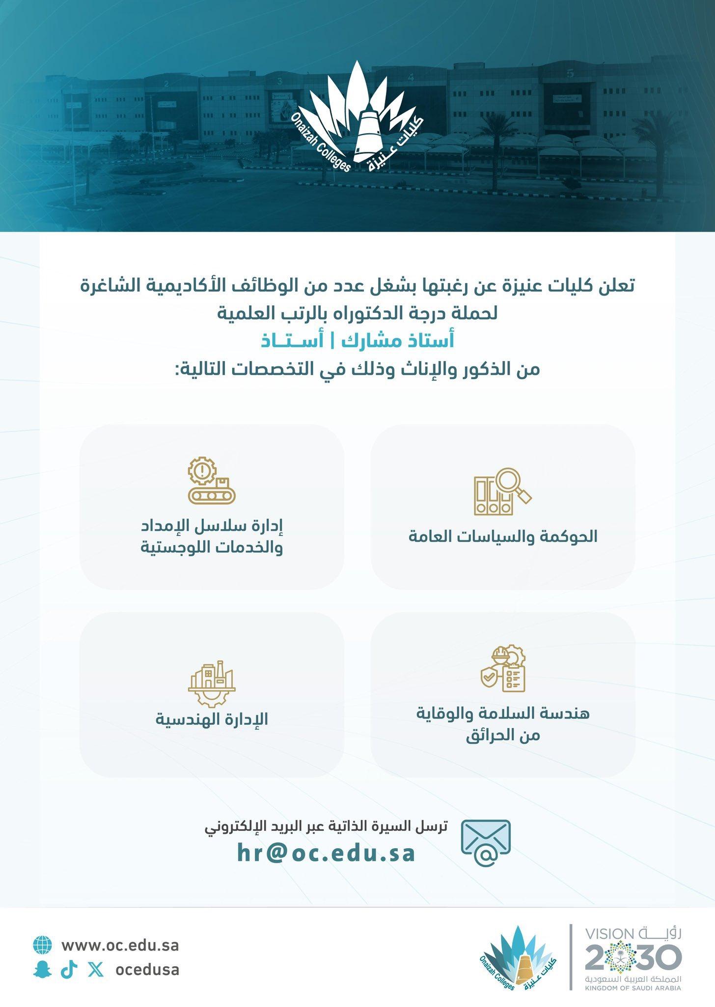 تُعلن كليات عنيزة عن رغبتها في شغل عدد من الفرص الوظيفية الأكاديمية الشاغرة لكل من الرجال والنساء ، وتستهدف هذه الفرص حملة درجة الدكتوراه من ذوي الخبرة في الرتب العلمية المرموقة (أستاذ مشارك / أستاذ)، في عدة تخصصات علمية حيوية، وفقا للتفاصيل وطريقة التقديم المبينة أدناه: