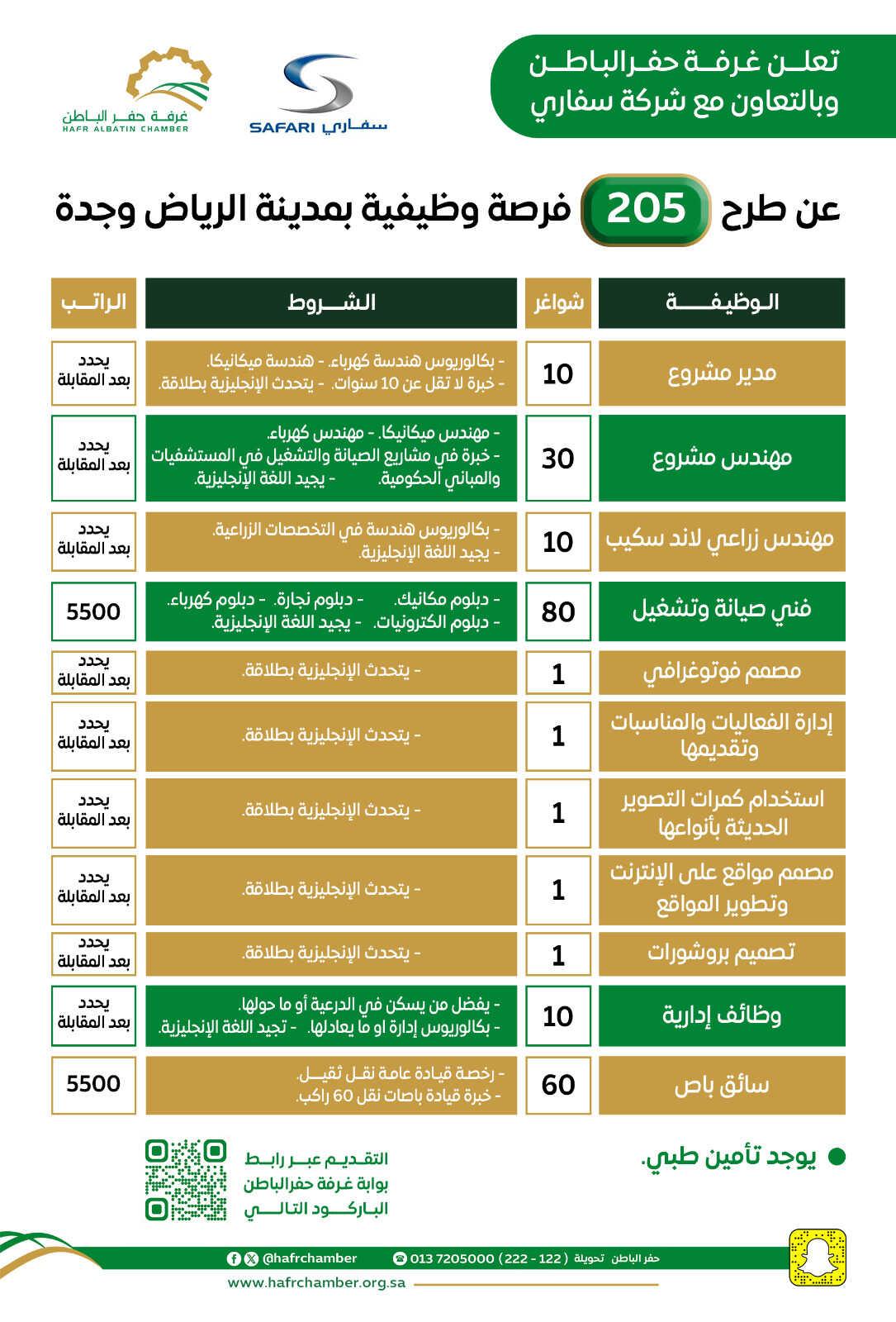 تعلن غرفة حفر الباطن عن وجود 260 وظيفة شاغرة، وسوف يكون العمل في الرياض وفي جدة، وذلك برواتب تبدأ من 4,000 ريال، وذلك وفقاً للتفاصيل التالية: