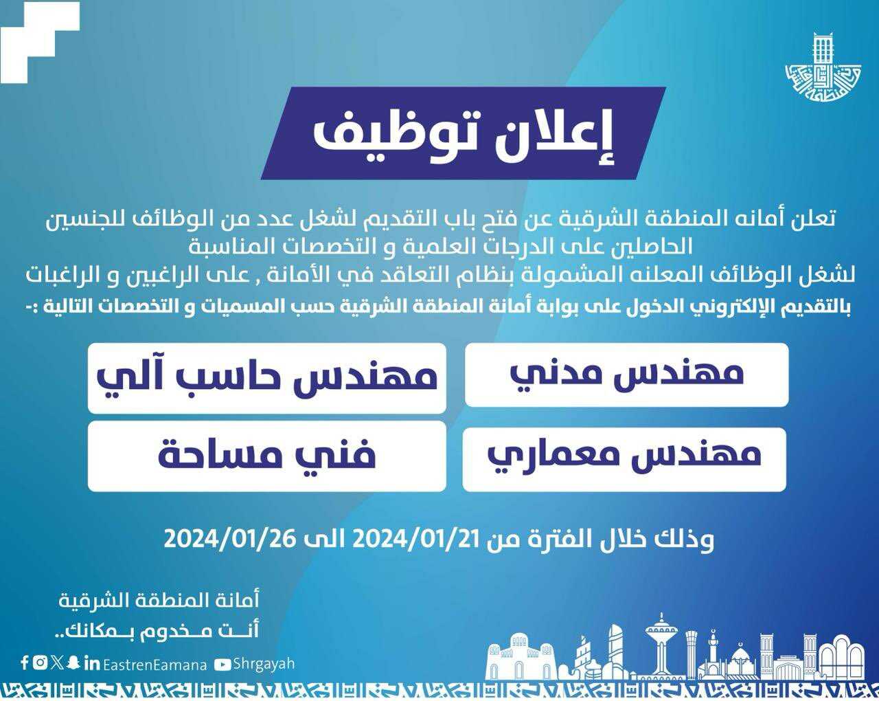 للتقديم في وظائف أمانة المنطقة الشرقية، اضغط هنا