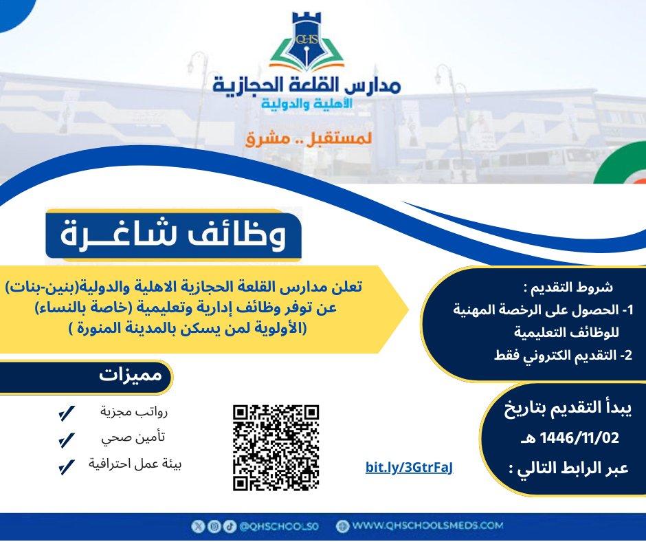 تعلن مدارس القلعة الحجازية الأهلية والدولية عن فتح باب التوظيف للنساء للانضمام إلى فريقها وسيكون العمل في الوظائف التعليمية والإدارية للعام الدراسي القادم 1447هـ، بالمدينة المنورة، وذلك وفقا للتفاصيل وطريقة التقديم المبينة أدناه: