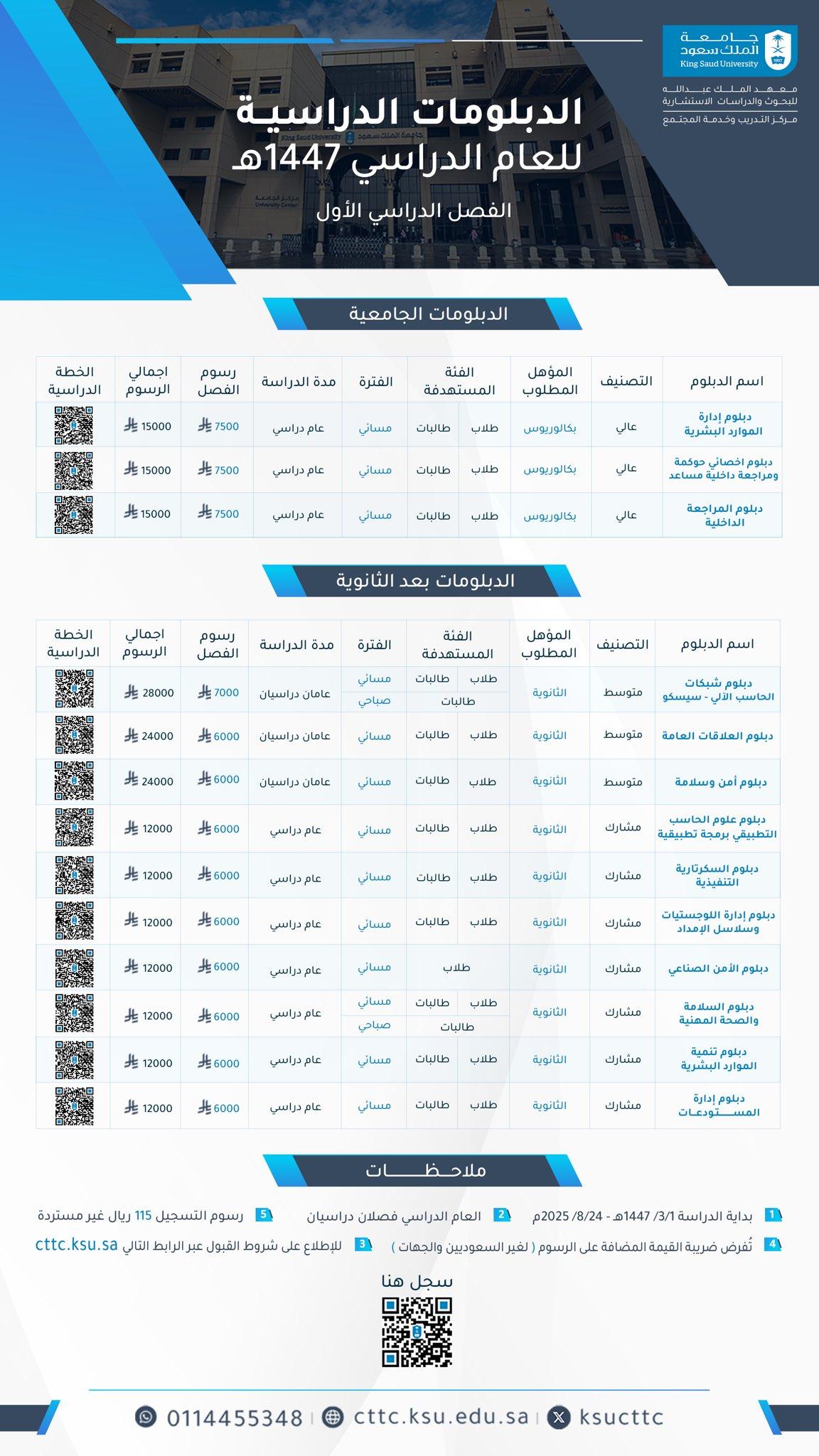 تعلن جامعة الملك سعود، من خلال مركز التدريب وخدمة المجتمع، عن فتح باب القبول في برامج الدبلومات المدفوعة للفصل الدراسي الأول من العام الجامعي 1447هـ. هذه البرامج، المتاحة في مدينة الرياض، تشمل دبلومات جامعية متقدمة لحملة البكالوريوس، وذلك وفقا للتفاصيل وطريقة التقديم المبينة أدناه: