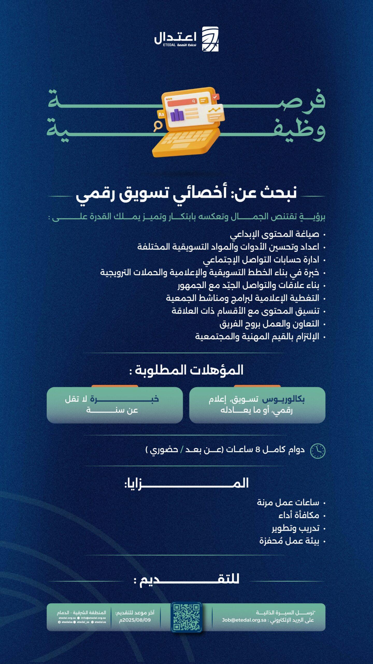 جمعية اعتدال تعلن فرصة وظيفية لأخصائي تسويق رقمي