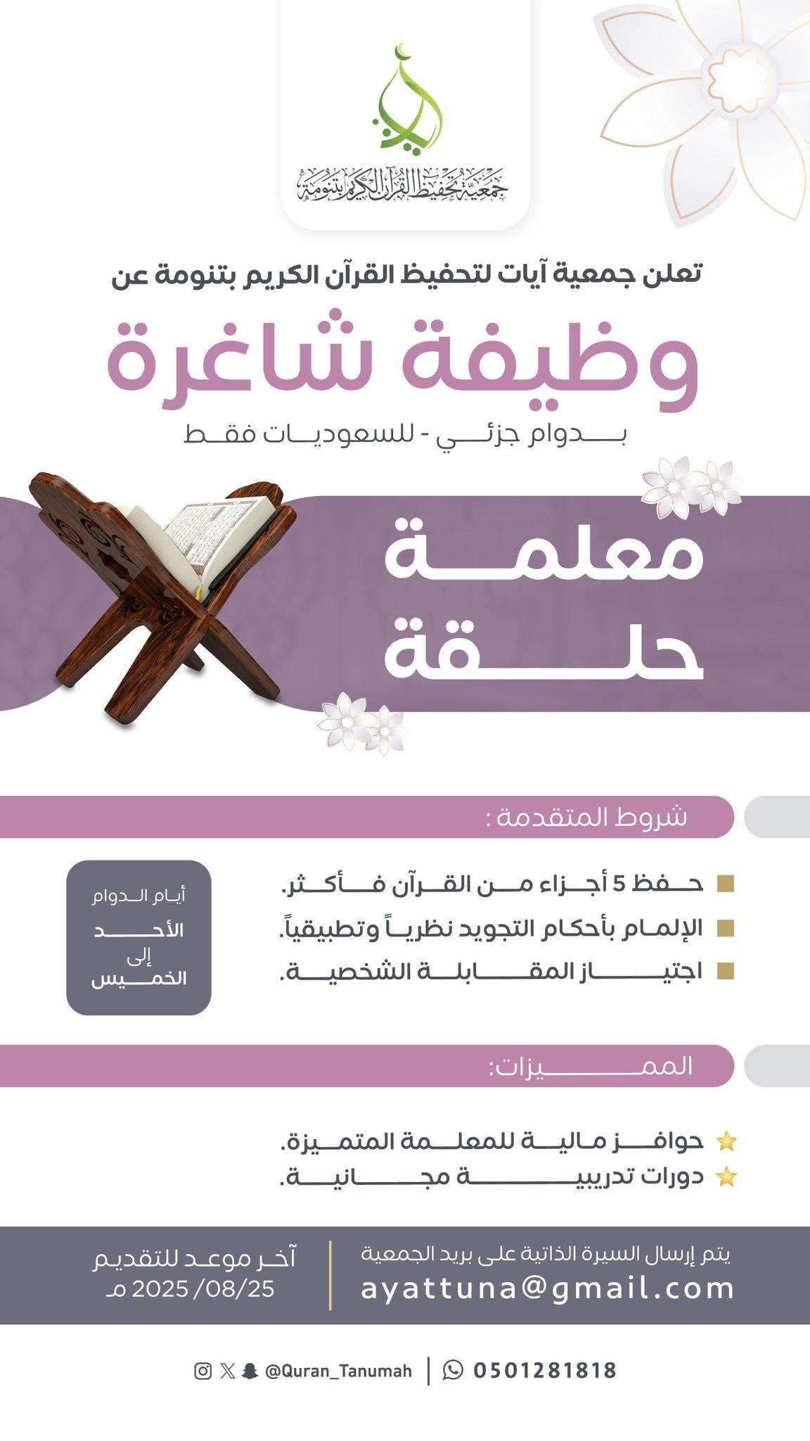إذا كنتِ تستوفين الشروط وتطمحين لهذه الفرصة المباركة في جمعية آيات لتحفيظ القرآن، يُرجى إرسال سيرتك الذاتية على البريد الإلكتروني التالي: