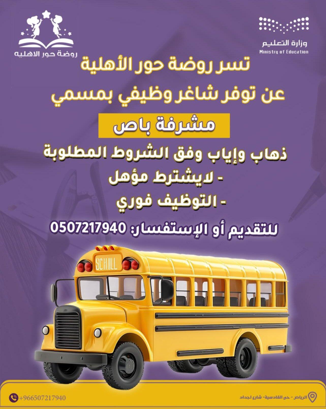 روضة حور الأهلية تطلب مشرفة باص بدون مؤهل محدد