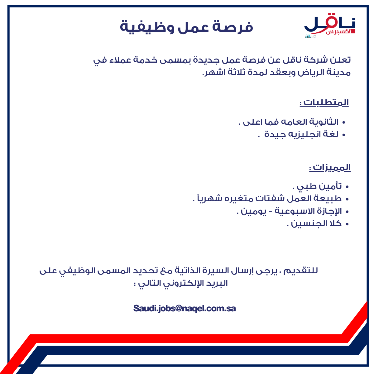 تعلن شركة ناقل إكسبرس، إحدى الشركات الرائدة في الشحن والخدمات اللوجستية، عن وجود وظائف خدمة عملاء للرجال والنساء في مدينة الرياض. هذه الوظائف بعقد عمل مؤقت لمدة ثلاثة أشهر، وذلك وفقا للتفاصيل وطريقة التقديم المبينة أدناه: