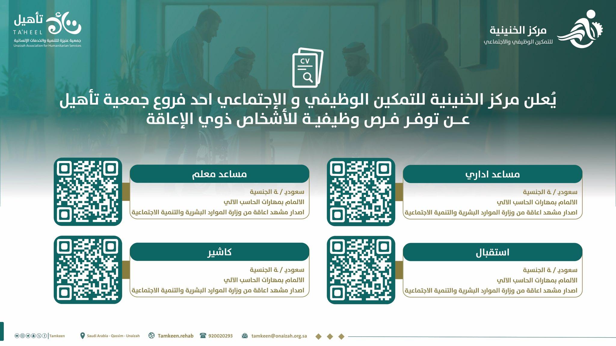 يُعلن مركز الخنينية للتمكين الوظيفي والاجتماعي (أحد فروع جمعية تأهيل) عن توفر فرص وظيفية مخصصة للأشخاص ذوي الإعاقة من الكفاءات الوطنية، يهدف المركز لدمج وتمكين الكوادر المؤهلة في سوق العمل. وذلك وفقا للتفاصيل وطريقة التقديم المبينة أداه: