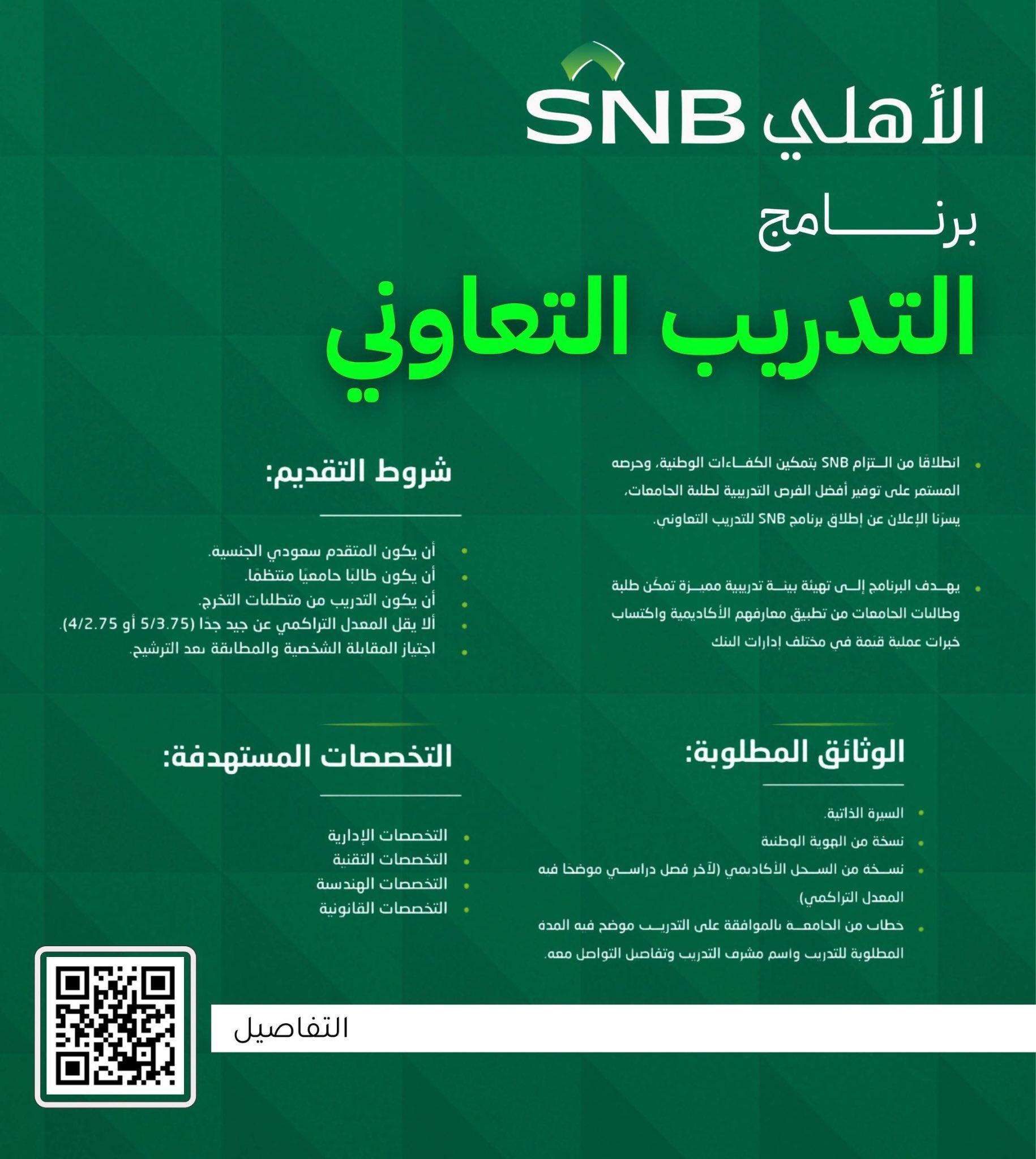 يعلن البنك الأهلي السعودي (SNB) عن فتح باب التقديم لـ برنامج التدريب التعاوني، والمخصص لطلبة وطالبات الجامعات. يهدف البرنامج إلى تمكين الكفاءات الوطنية وتطوير مهاراتهم عبر اكتساب خبرات عملية قيمة في مختلف إدارات البنك، وذلك وفقا للتفاصيل وطريقة التقديم المبينة أدناه: