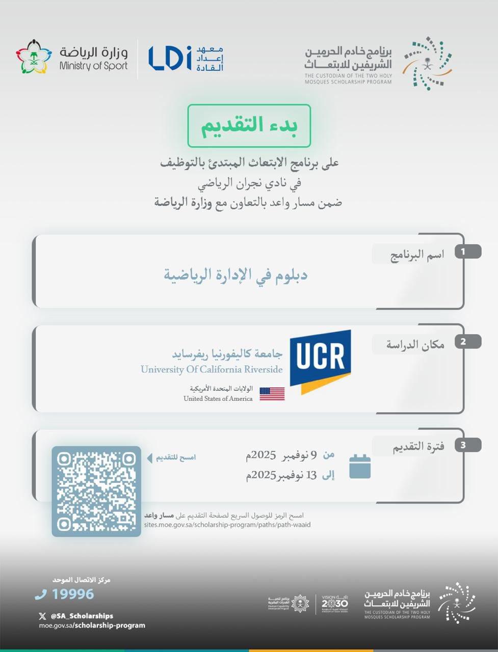 يعلن نادي نجران الرياضي بالتعاون مع وزارة الرياضة عن فتح باب التقديم في برنامج الابتعاث المبتدئ بالتوظيف ضمن مسار “واعد” من برنامج خادم الحرمين الشريفين، وذلك وفقا للتفاصيل وطريقة التقديم المبينة أدناه: