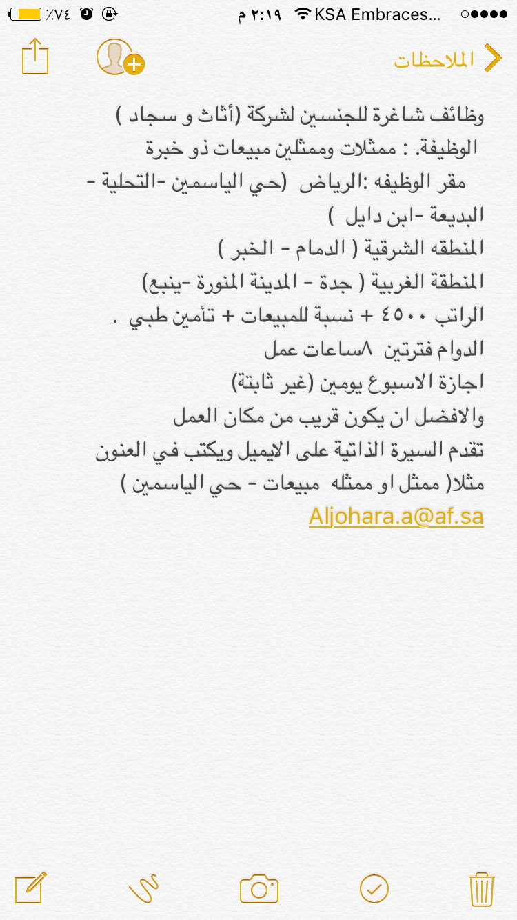 شركة أثاث وسجاد تطرح وظائف للنساء والرجال بمسمى ممثل وممثلة مبيعات ،وتشترط وجود خبرة ومقر الوظيفة ، في (الرياض-الخبر-الدمام-جدة -المدينة المنورة-ينبع)