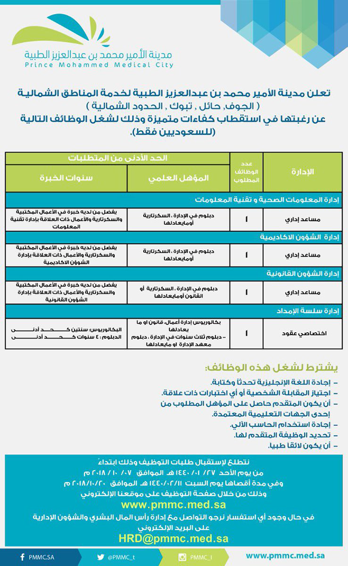 أعلنت مدينة الأمير محمد بن عبدالعزيز الطبية لخدمة المناطق الشمالية (الجوف، حائل، تبوك، الحدود الشمالية) عن رغبتها في استقطاب كفاءات متميزة من السعوديين لشغل الوظائف الإدارية التالية: