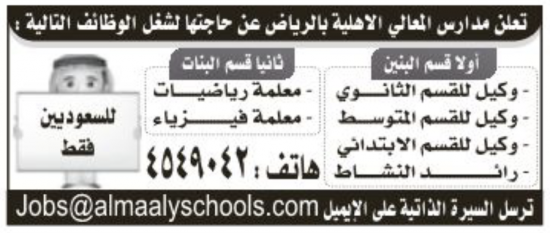 تعلن مدارس المعالي الأهلية بالرياض عن توفر وظائف تعليمية شاغرة (قسم البنين،وقسم البنات) وفق التفاصيل أدناه: