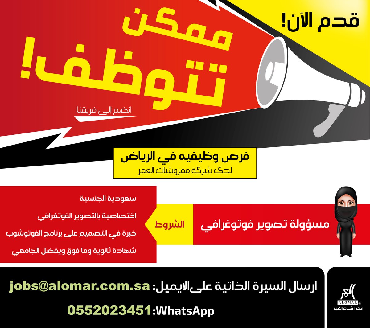 شركة مفروشات العمر تعلن عن وظيفة بمسمى مسؤولة تصوير فوتوغرافي لدى شركة مفروشات العمر في الرياض،التفاصيل أدناه: