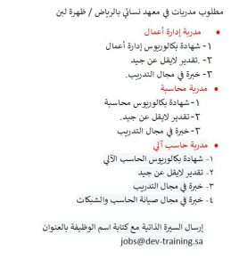 وظائف مدربات في معهد نسائي بالرياض ظهرة لبن ،و غيرها….
