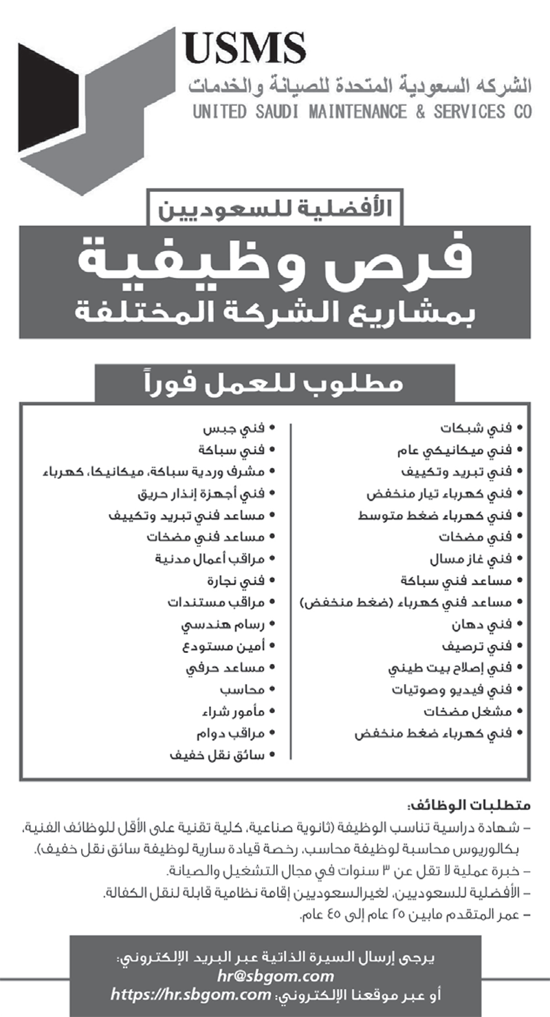 تعلن الشركة السعودية المتحدة للصيانة والخدمات (USMS) عن توفر فرص وظيفية (فنية وإدارية) للرجال في مشاريع الشركة المختلفة بالمسميات التالية: