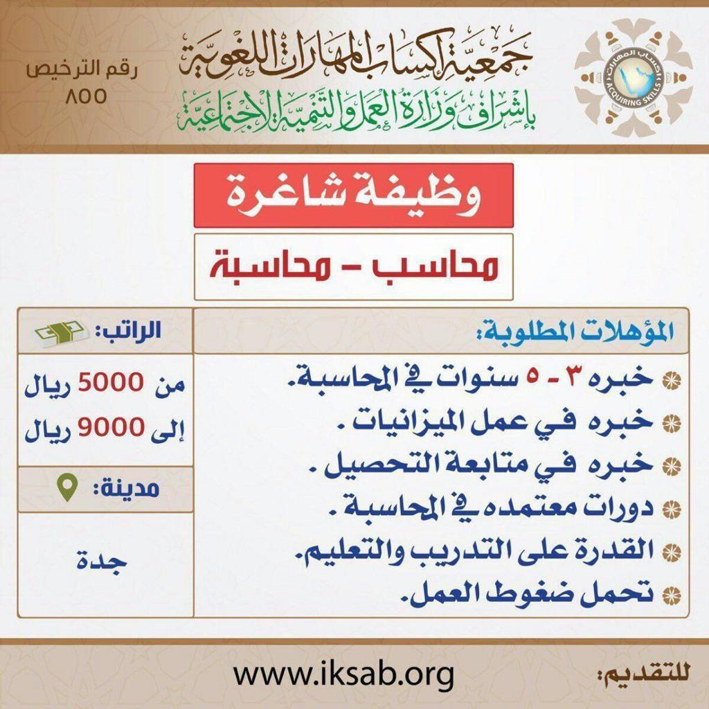 جمعية اكساب المهارات اللغوية في جدة تعلن عن توفر وظائف للرجال والنساء ،بمسمى محاسب/ة ورواتب تتراوح بين 5000 و9000.. تفاصيل أكثر في المرفق أدناه