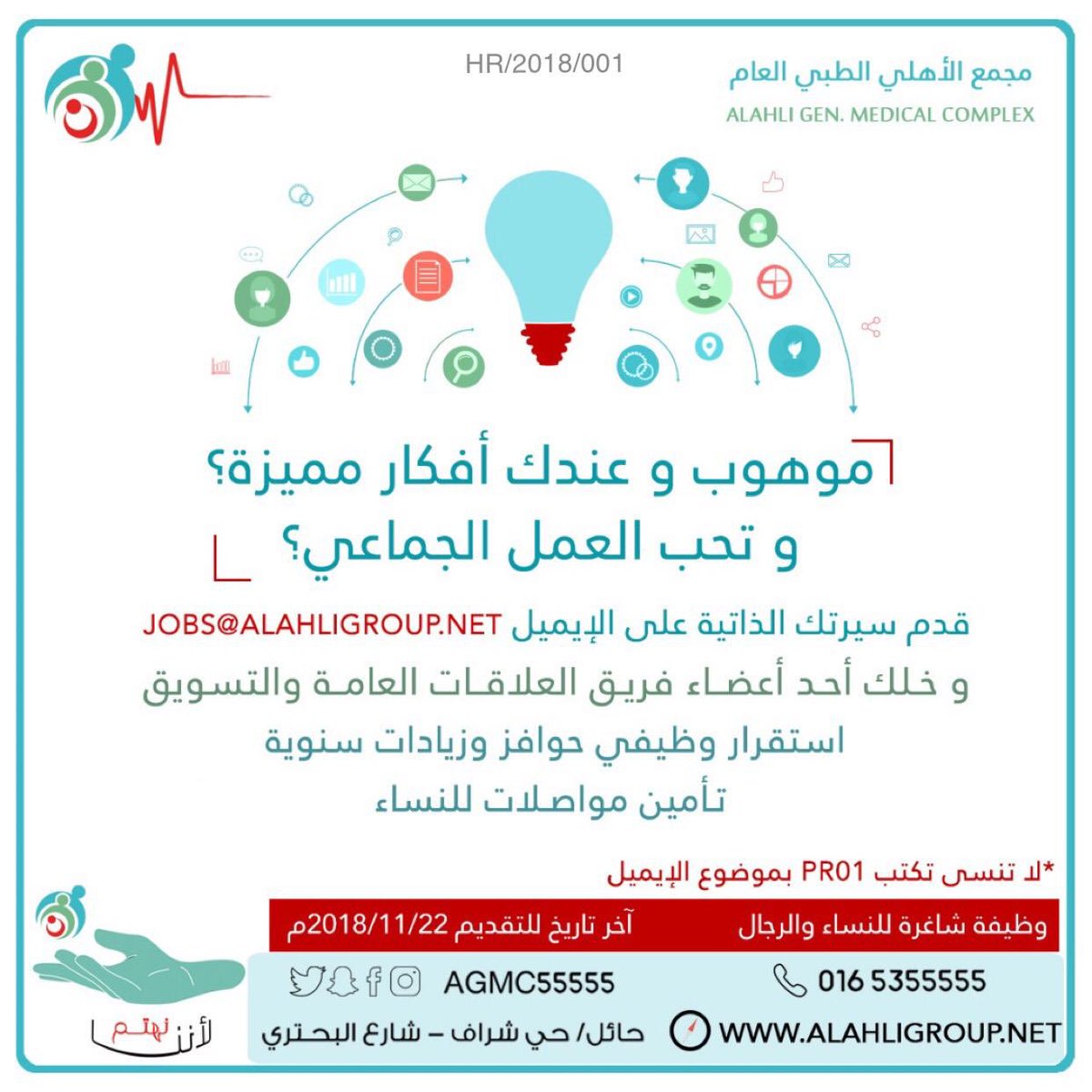 مطلوب مسؤول علاقات عامة وتسويق من الجنسين للعمل لدى مجموعة الأهلي الطبية بحائل باستقرار وظيفي حوافز وزيادات سنوية
