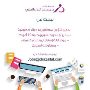 مجمع عيادات الدكتور مساعد الزلال الطبي، في الرياض،تعلن عن وجود وظائف إدارية بالمسميات مدير شؤون موظفين و مدير دوائر حكومية ،مدير أو مديرة تسويق، بخبرة ١٠ أعوام ،موظفات إستقبال و، خدمة عملاء، مسؤولات تسويق ..