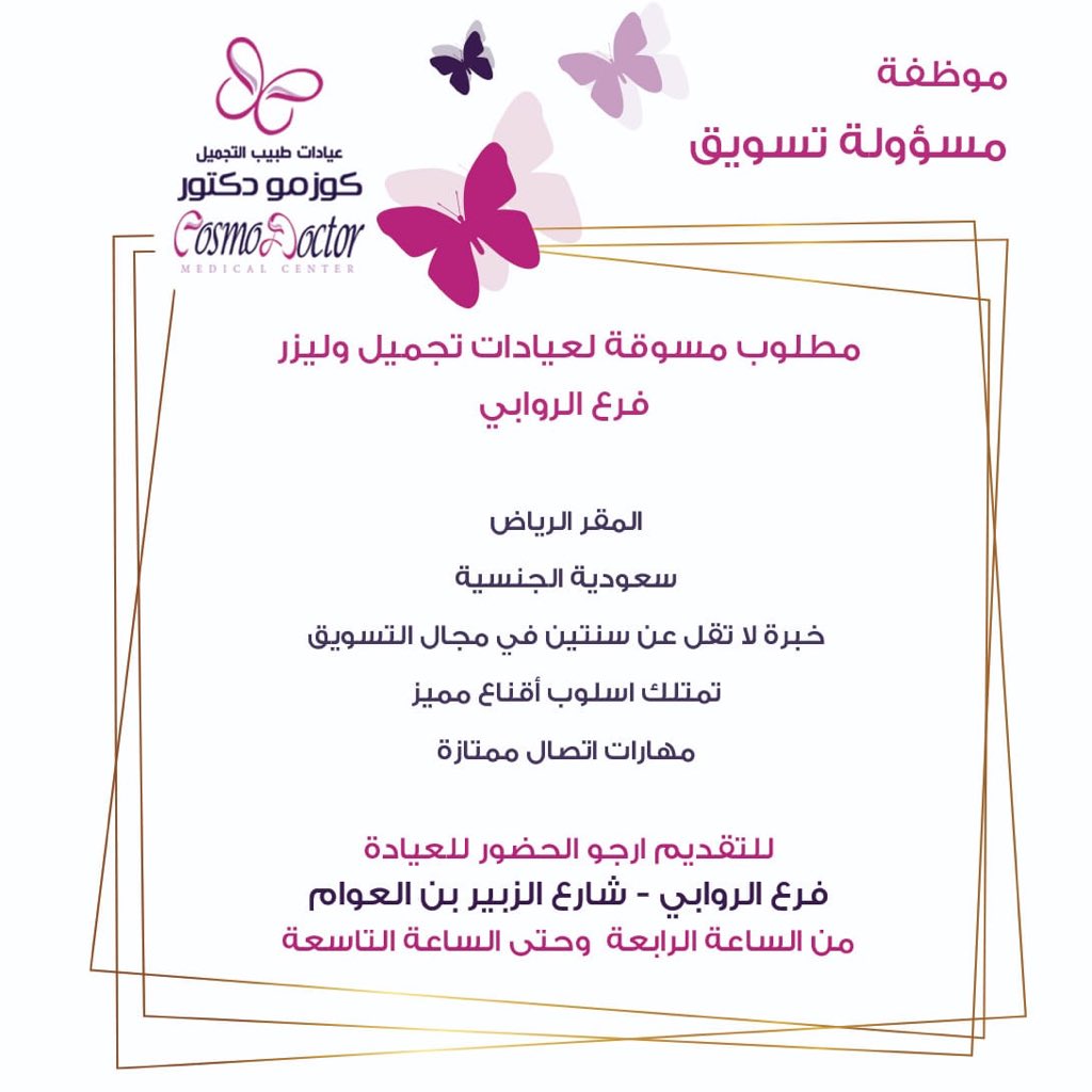 عيادات تجميل في الرياض في حي الروابي تعلن عن حاجتها إلى مسؤولة تسويق ،سعودية الجنسية، خبرة لاتقل عن سنتين في مجال التسويق،تمتلك أسلوب اقناع مميز ،ومهارات اتصال ممتازة.