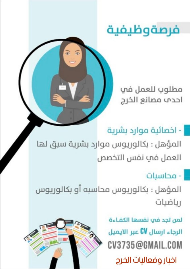 يعلن مصنع في الخرج عن وظائف نسائية شاغرة بمسمى (أخصائية موارد بشرية،محاسبات )،التفاصيل أدناه: