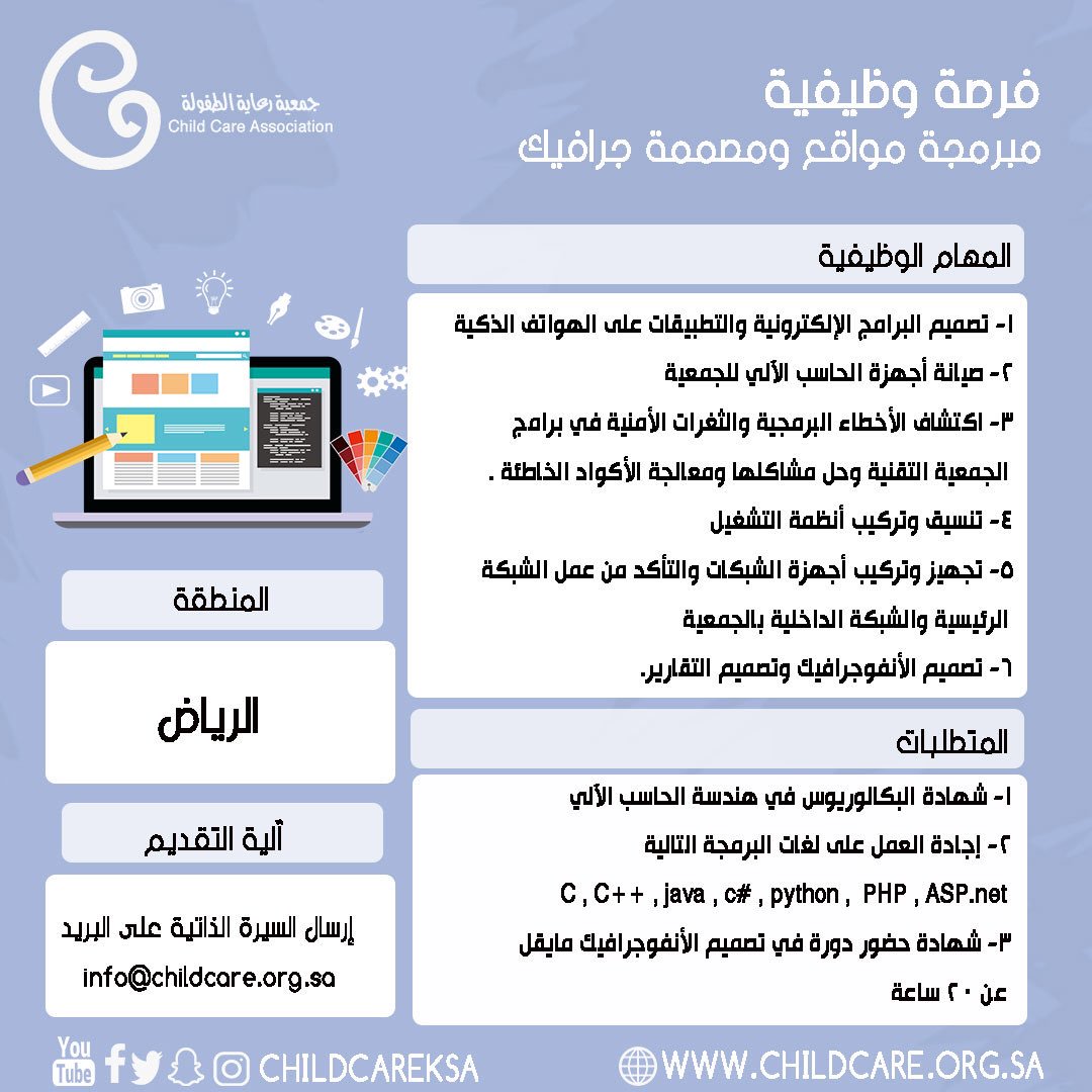 جمعية رعاية الطفولة تعلن عن وظيفة شاغرة بمسمى ” مبرمجة مواقع ومصممة جرافيك ” واشترطت الجمعية شهادة البكالريوس في الحاسب الآلي ، اجادة العمل على لغات البرمجة ،شهادة حضور دورة في تصميم الانفوجرافيك لاتقل مدة الدورة عن 20 ساعة وذلك للعمل في مدينة الرياض
