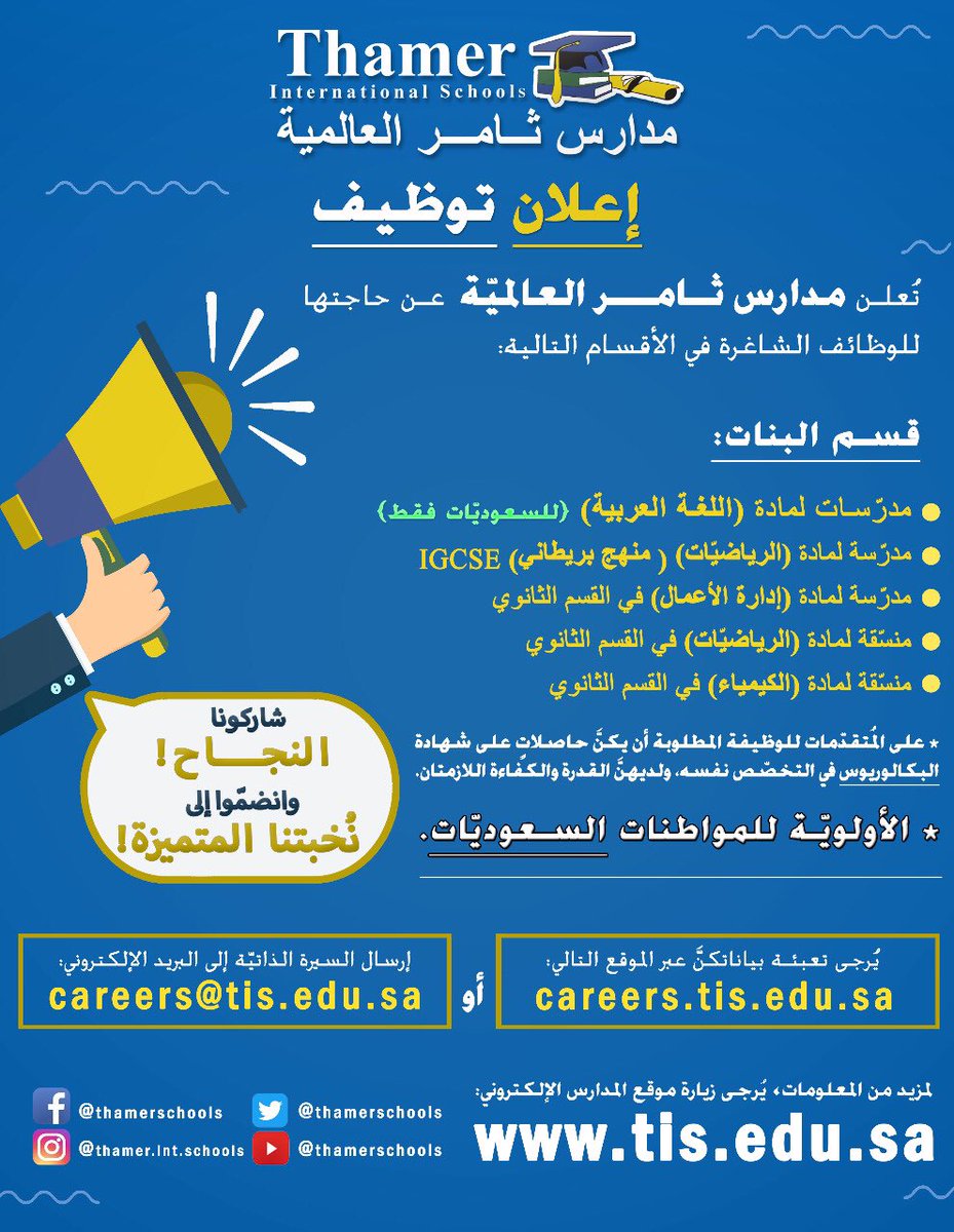 وظائف تعليمية في عدة تخصصات بمدارس ثامر العالمية