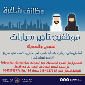 شركة أشجان نجد تعلن عن وظائف للسعوديين والسعوديات في لعمل بفروع الشركة في الرياض ،جدة ،ابها ،الخبر ،الخرج ،جازان – الاحساء ،المدينة المنورة، والأولوية لأصحاب الخبرة.