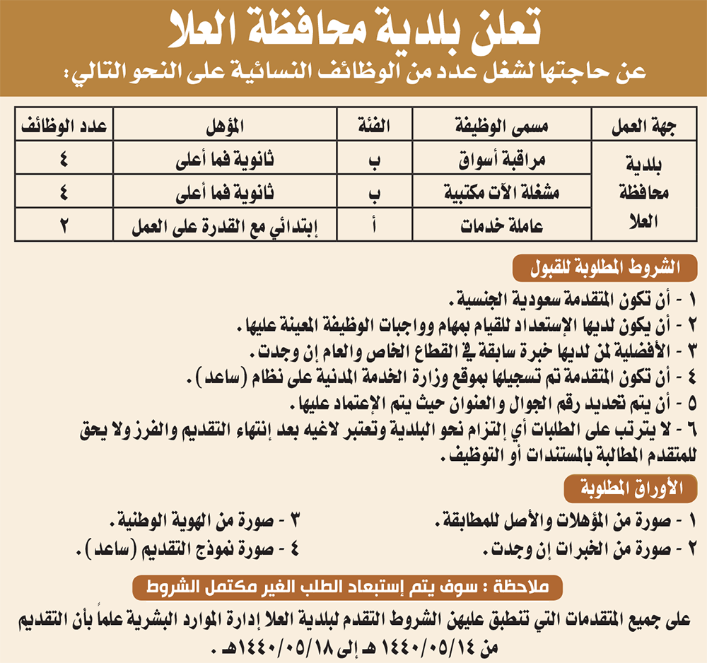بلدية محافظة العلا عن توفر وظائف نسائية شاغرة على بند الأجور لحملة الابتدائية والكفاءة والثانوية فما فوق، أن تكون المتقدمة سعودية الجنسية، لديها الاستعداد للقيام بمهام وواجبات الوظيفة المعينة عليها،و الأفضلية لمن لديها خبرة سابقة في القطاع الخاص أو العام (إن وجدت)،أن تكون المتقدمة مسجلة بنظام (ساعد) في موقع وزارة الخدمة المدنية.