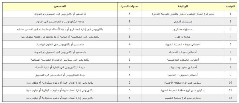 أعلن المركز الوطني للنخيل والتمور عبر موقعه الإلكتروني توفر وظائف إدارية شاغرة للعمل بعدة مدن بالمملكة، للعمل بالمسميات التالية (مدير فرع المركز الوطني للنخيل والتمور بالمدينة المنورة، ومستشار قانوني، ومسؤول مشاريع مراجع داخلي، وأخصائي جودة، وأخصائي جودة، وأخصائي الخدمات اللوجستية، وأخصائي عقود ومشتريات، وأخصائي تسويق، وسكرتير مدير فرع منطقة الأحساء، وسكرتير مدير فرع منطقة المدينة المنورة، وسكرتير مدير فرع منطقة القصيم)..