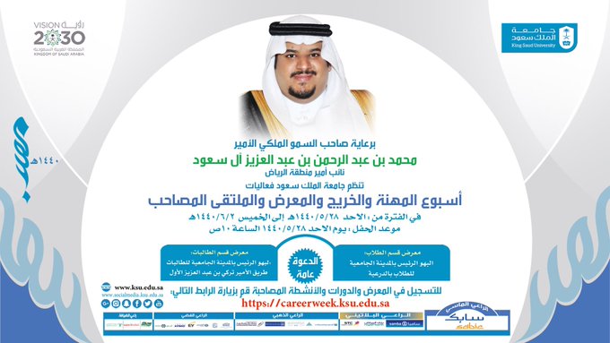 انطلاق أسبوع المهنة والخريج تحت رعاية نائب أمير منطقة الرياض وبمشاركة 50 شركة وأكثر من 1000 وظيفة شاغرة.