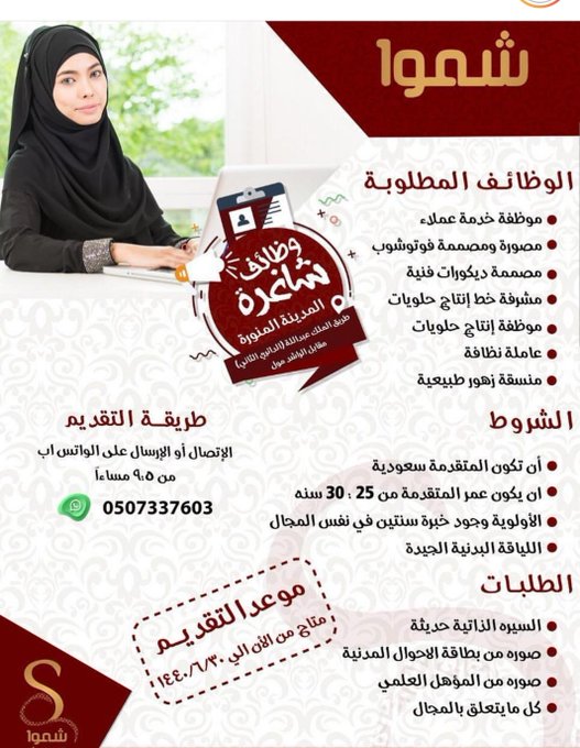 أعلنت مؤسسة شموا في المدرينة المنورة عن توفر وظائف للنساء في مجالات مختلفة ، واشترطت المؤسسة ، أن تكون سعودية الجنسية ،عمر المتقدمة بين 25-30 سنة ،مع أولوية وجود خبرة سنتين في نفس المجال. وجاءت الوظائف بالمسميات التالية::
