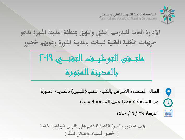 اعلنت المؤسسة العامة للتدريب التقني والمهني عن إقامة (ملتقى التوظيف التقني 2019) لخريجات الكلية التقنية للبنات بالمدينة المنورة على النحو التالي: