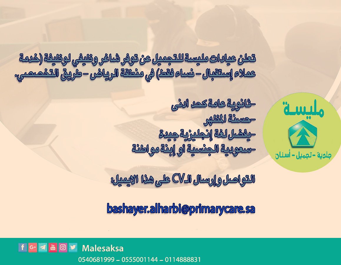 تعلن عيادة مليسة للتجميل عن توفر وظيفة خدمة عملاء واستقبال للسعوديات أو ابنة مواطنة ،حاصلة على الثانوي ،حسنة المظهر ،مع ايجاد اللغة الإنجيزية تحدثا وكتابة.