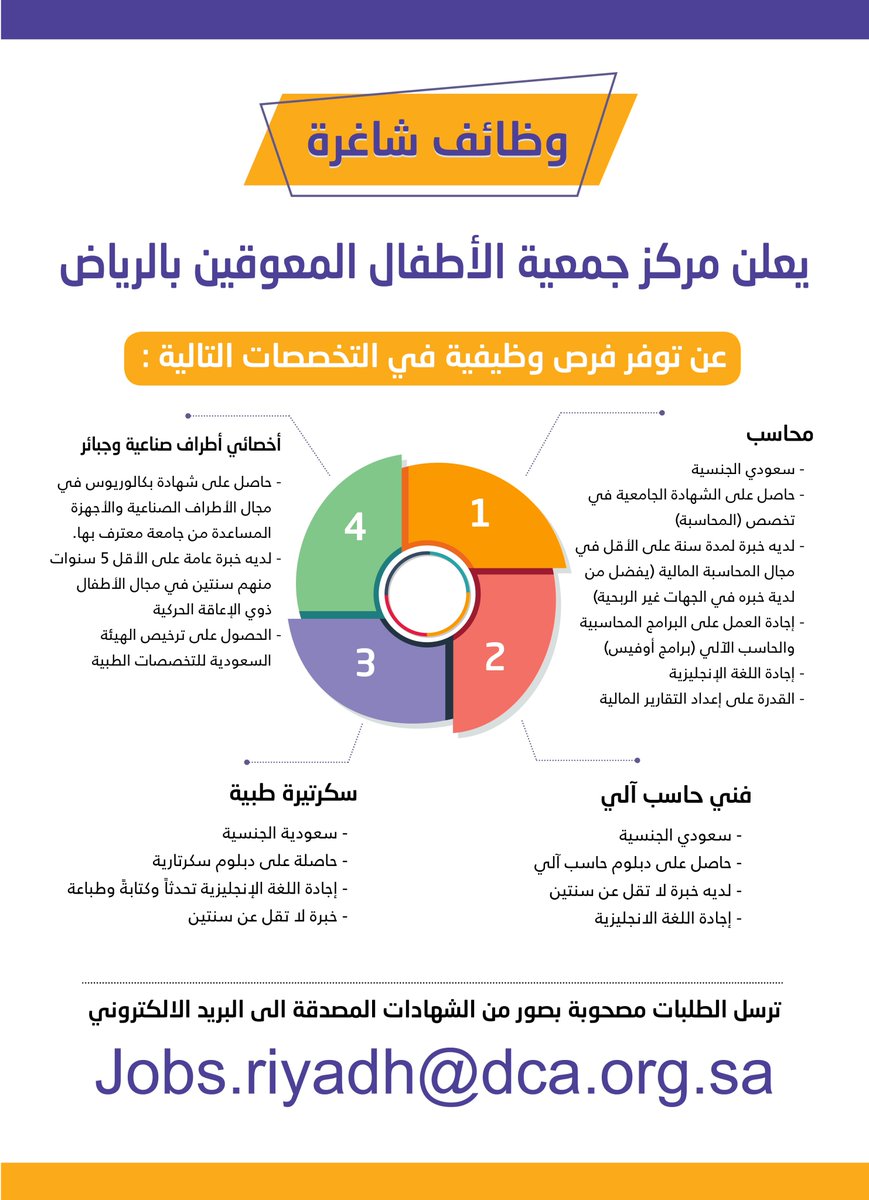 اعلنت جمعية الأطفال المعوقين توفر وظائف للجنسين بمركز الملك فهد بالرياض، للعمل بالمسميات التالية ::