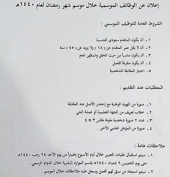 **الموعد:: التقديم متاح الآن وينتهي يوم الخميس القادم بتاريخ 1440/08/06هـ (خلال أوقات الدوام الرسمي)