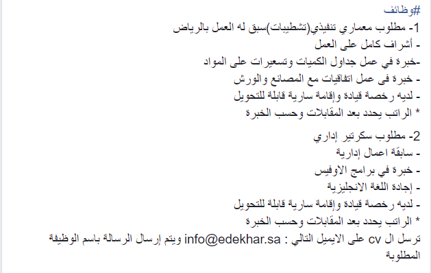 ترسل ال cv على الايميل التالي : info@edekhar.sa ويتم إرسال الرسالة باسم الوظيفة المطلوبة