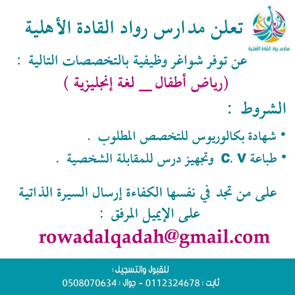 مدارس رواد القادة الأهلية تعلن عن توفر وظائف نسائية في التخصصات (رياض أطفال) (لغة انجليزية)