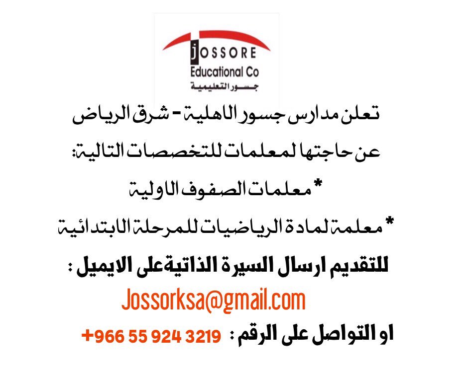 تعلن مدارس الجسور الأهلية شرق (الرياض) عن حاجتها إلى معلمات (صفوف أولية) ومعلمة مادة (الرياضيات) للمرحلة الإبتدائية