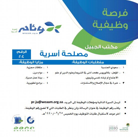 جمعية وئام بالجبيل توفر وظائف للجنسين بمميزات عالية