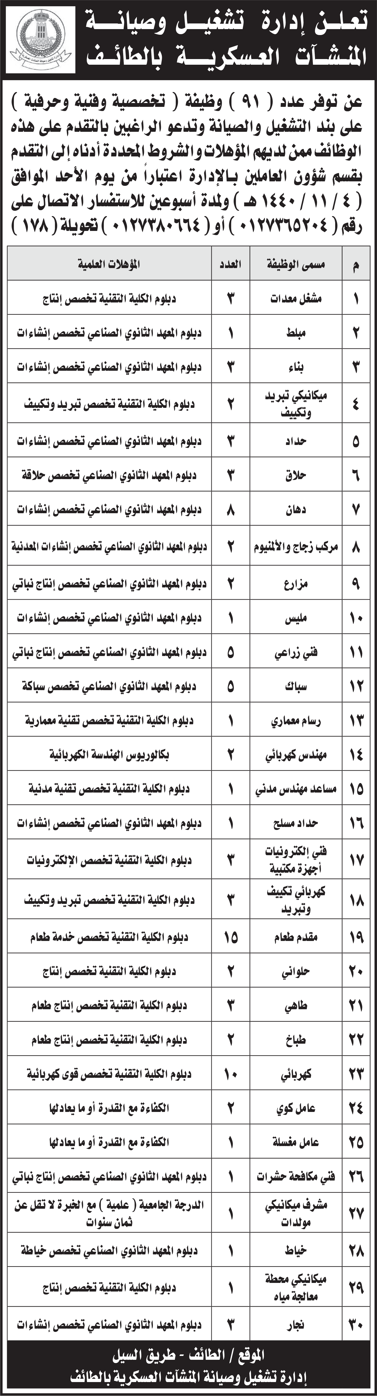 تعلن إدارة تشغيل وصيانة المنشآت العسكرية في (الطائف) عن توفر (91) وظيفة متنوعة (تخصصية وفنية وحرفية) على بند التشغيل والصيانة لحملة الكفاءة والدبلوم والبكالوريوس بالمسميات التالية: