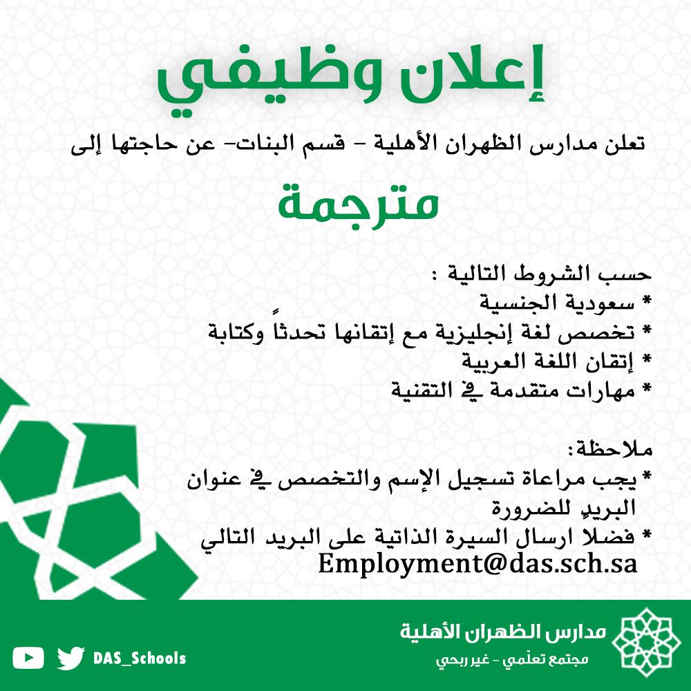 تعلن مدارس الظهران الأهلية ” قسم البنات ” ، فتح باب التقديم إلى عدة وظائف شاغرة (للنساء) في مجال الترجمة؛ للعمل تحت مسمى ” مُترجمة ” . التفاصيل أدناه