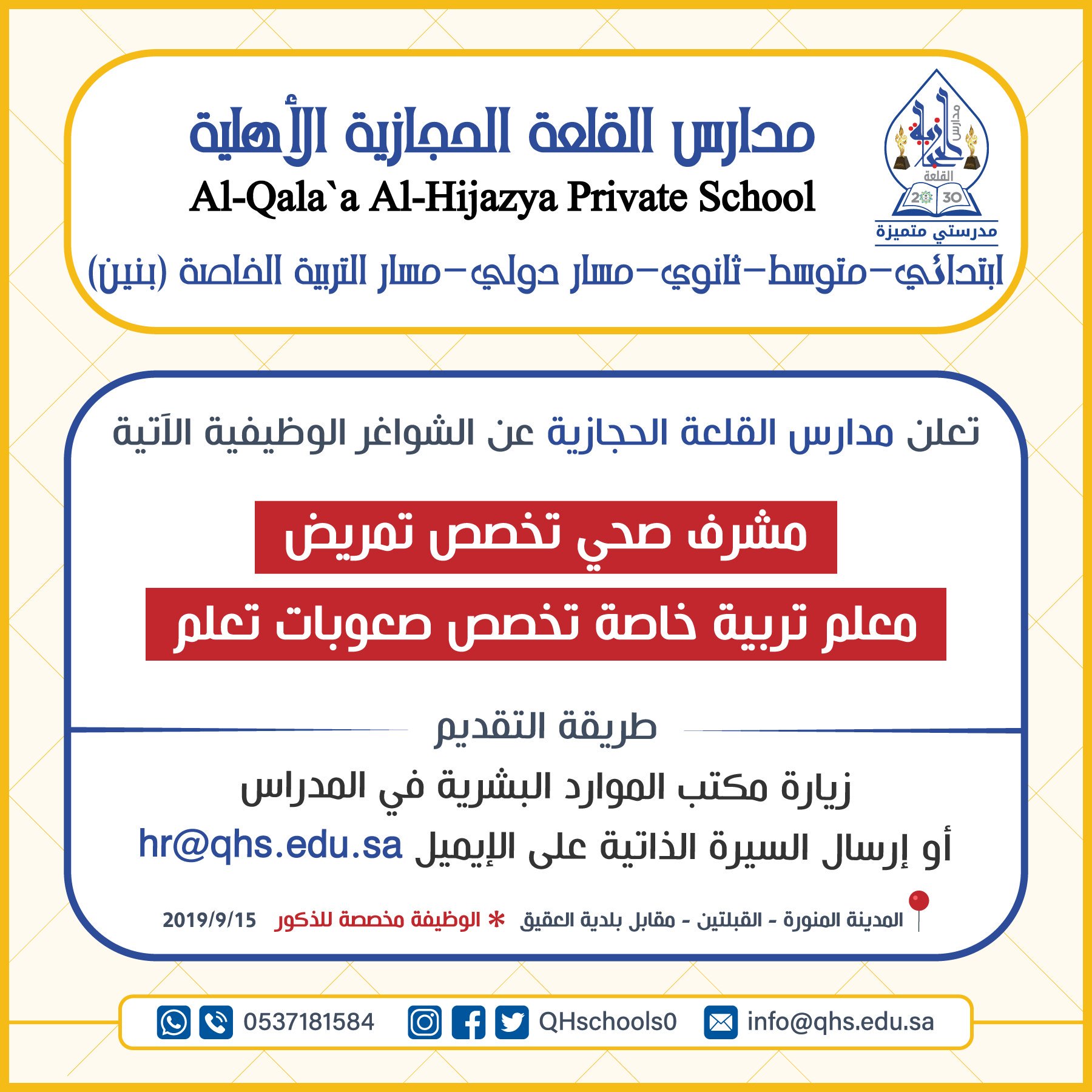 تعلن مدارس القلعة الحجازية في (المدينة المنورة) عن توفر عدد من الوظائف الشاغرة!