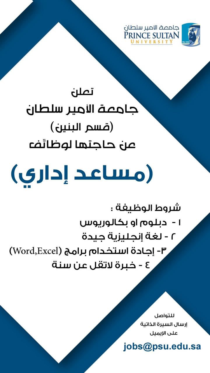 أعلنت جامعة الأمير سلطان بالرياض (قسم البنين) عن حاجتها لشغل وظائف (مساعد إداري) لحملة الدبلوم أو البكالوريوس ،التفاصيل أدناه: