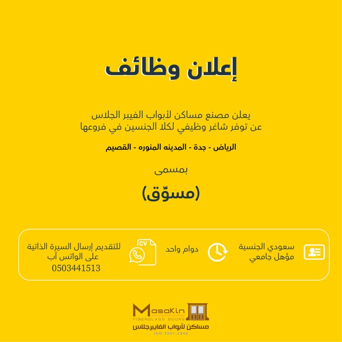 يعلن مصنع مساكن لأبواب الفيبر جلاس عن توفر شاغر وظيفي بمسمى (مسوق) وذلك للعمل بفروع المصنع في (الرياض-جدة-المدينة المنورة -القصيم)، وذلك وفق الشروط التالية:
