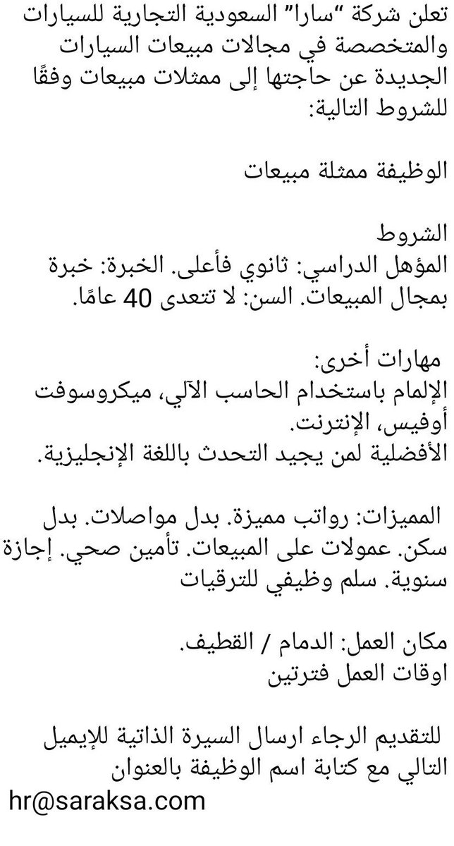 تعلن شركة سارا السعودية التجارية للسيارات والمتخصصة في مجالات مبيعات السيارات الجديدة عن حاجتها إلى ممثلات مبيعات للعمل في (الدمام-القطيف) وفقًا للشروط التالية: