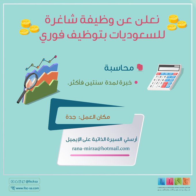 يعلن مركز تحفيز اللغة والسمع في جدة عن وظيفة شاغرة للسيدات بمسمى (محاسبة)،التفاصيل في الصورة أدناه: