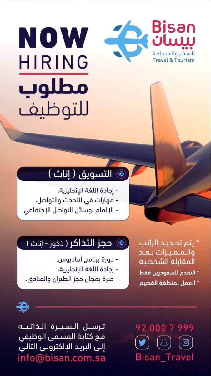 تعلن وكالة بيسان للسفر والسياحة عن وظائف للسعوديين من الجنسين فى (القصيم)،التفاصيل أدناه: