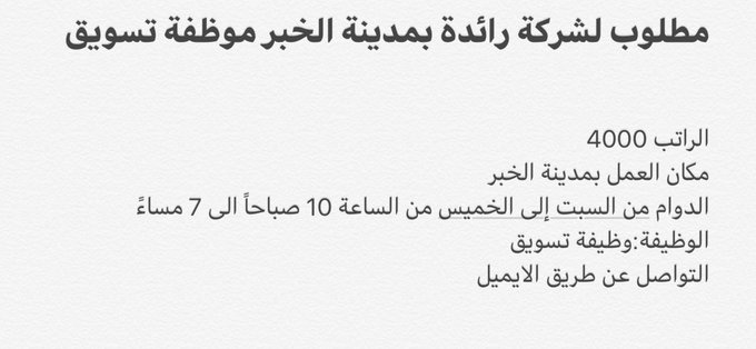 تعلن شركة المرافق عن توفر وظيفة (أخصائية تسويق ) وذلك للعمل في مدينة الخبر: