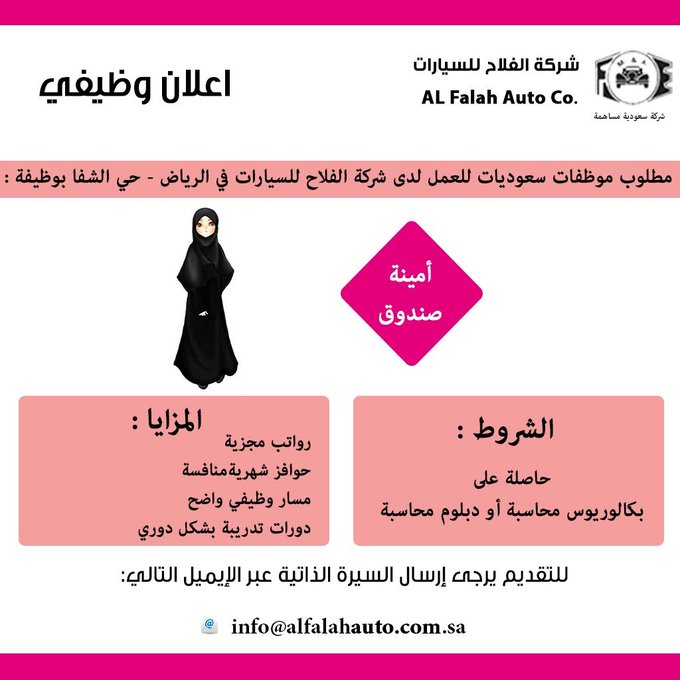 للتقديم يرجى إرسال السيرة الذاتية عبر الإيميل التالي : info@alfalahauto.com.sa