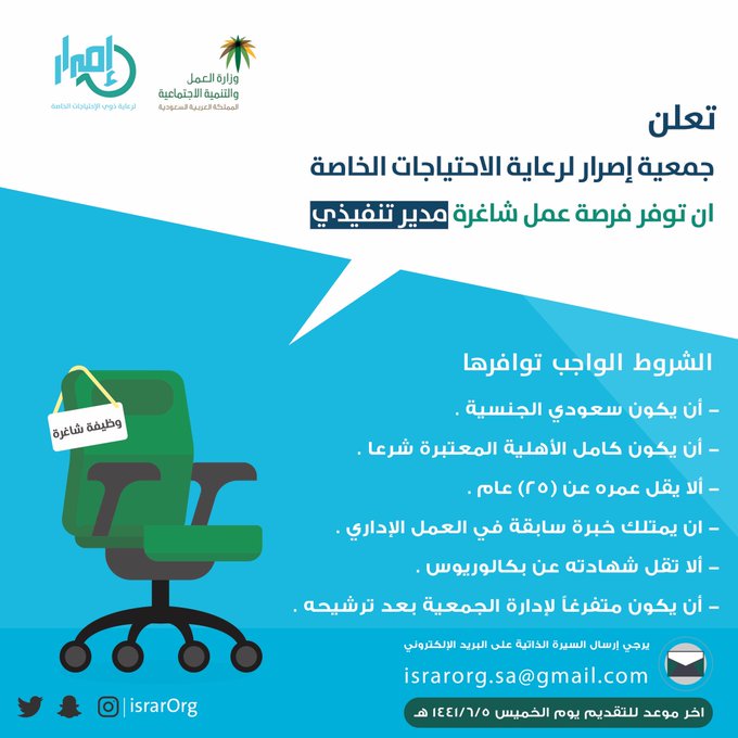 تعلن جمعية إصرار لذوي الاحتياجات الخاصة فى (عرعر) عن وظيفة شاغرة بمسمى( مدير تنفيذى)